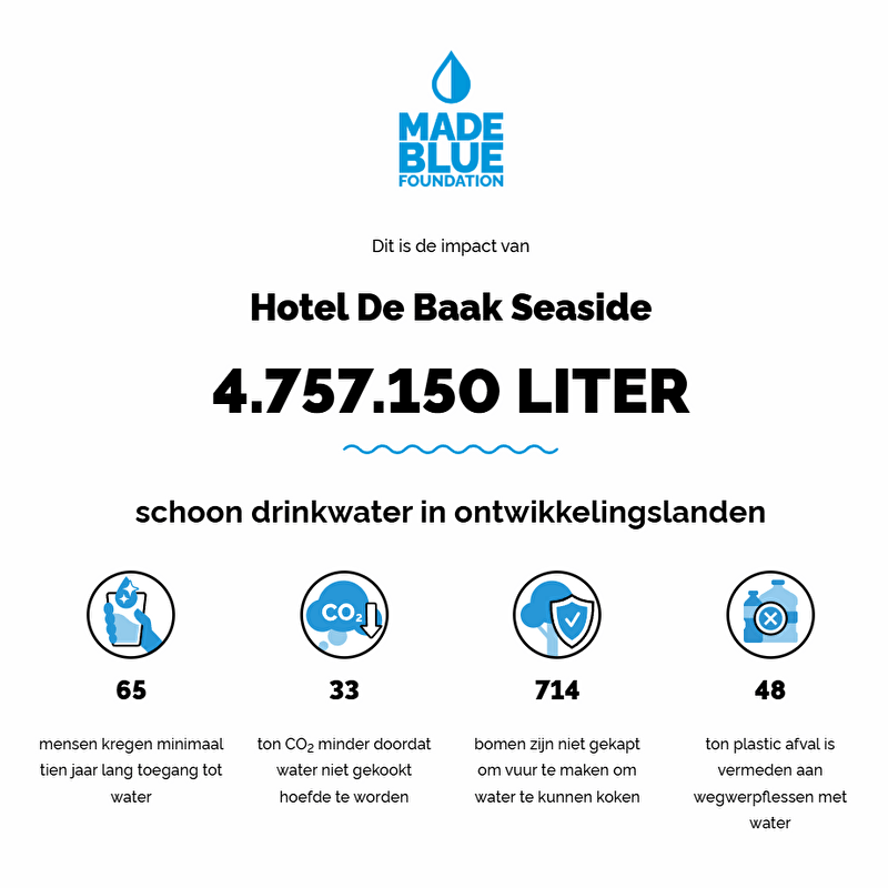 We verbruiken water, materialen en voeding. Daarom doen we ook graag iets terug voor de aarde. Sinds 1 januari 2022 werken wij samen met Hotels for Trees. We planten een boom voor elke gast die ervoor kiest om één of meerdere schoonmaakmomenten over te slaan tijdens een meerdaags verblijf. Daarbij letten we zelf niet alleen extra goed op ons waterverbruik, maar verzoeken onze hotelgasten dat ook te doen. In iedere hotelkamer hangt een deurhanger met het verzoek om water te besparen. Bijvoorbeeld door de kraan uit te zetten, korter te douchen en de handdoeken te hergebruiken. Door de QR-code op de hanger te scannen, kunnen onze gasten zelf kiezen aan welk project zij hun bespaarde water willen doneren.