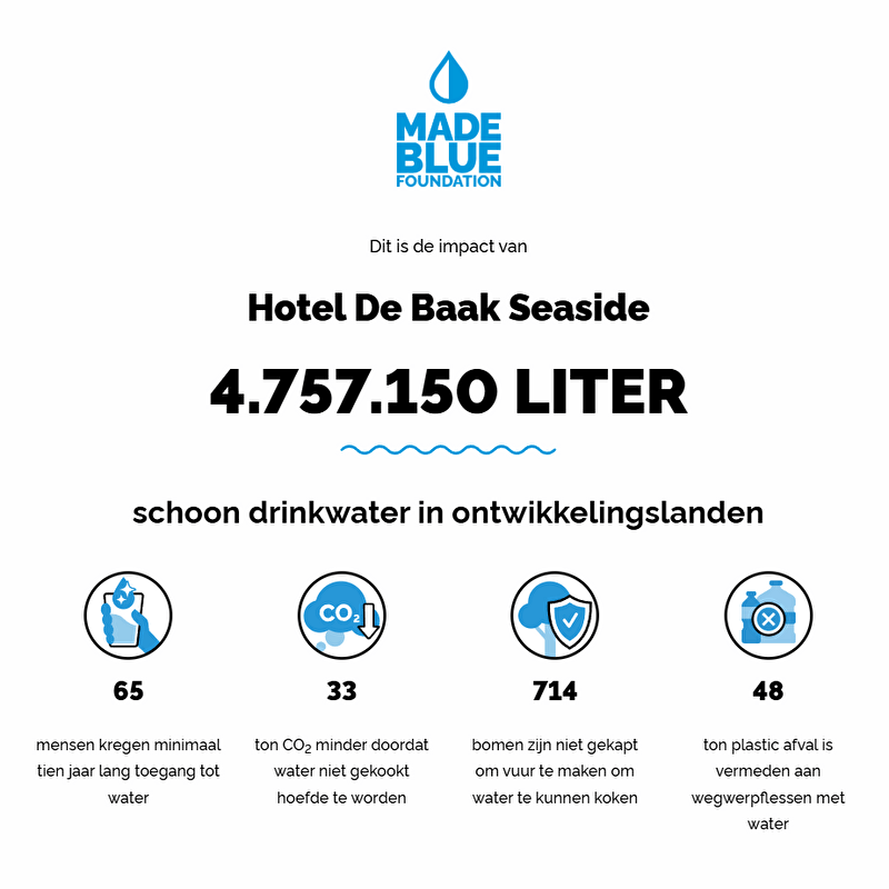 In iedere hotelkamer hangt een hanger aan de kraan met het verzoek om water te besparen. Door de QR-code van Made Blue Foundation te scannen, kunnen onze gasten zelf kiezen aan welk project zij hun bespaarde water willen doneren. We zijn ontzettend trots om te laten zien wat we sinds januari van dit jaar hebben gedoneerd.